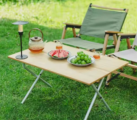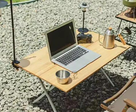 Складний портативний бамбуковий та алюмінієвий стіл, який є міцним, міцним та екологічно чистим. Та ефективні водонепроникні. Гладка стільниця ідеально підходить для розміщення напоїв, закусок або кулінарного обладнання.